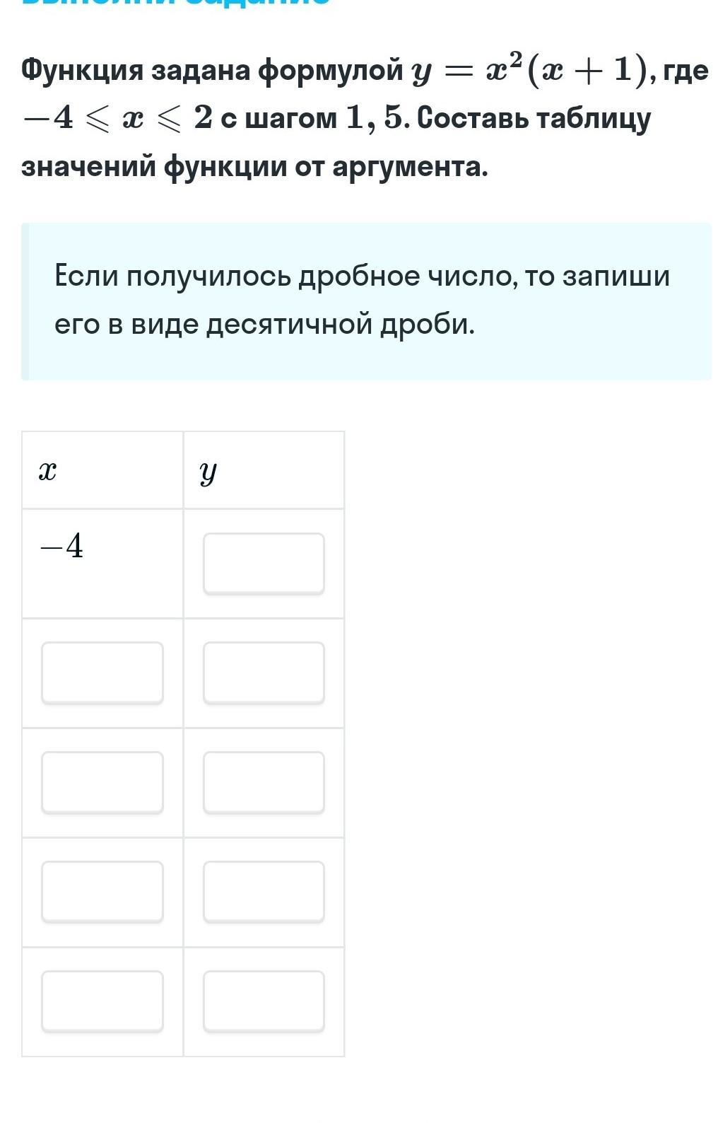 -4 ,-2.5, -1, 0.5 ,2 сразу под ними знач у(подставляем х в формулу)