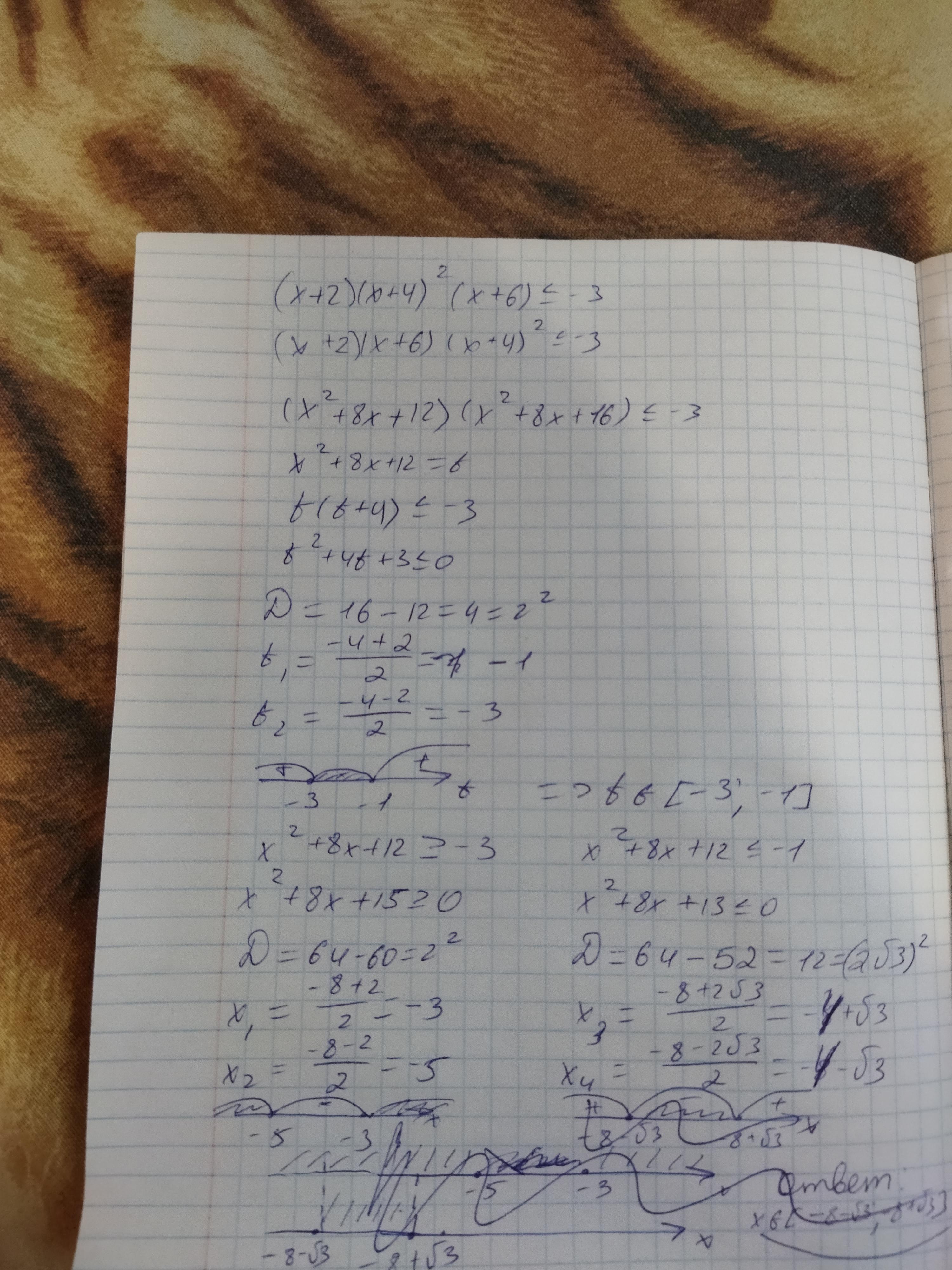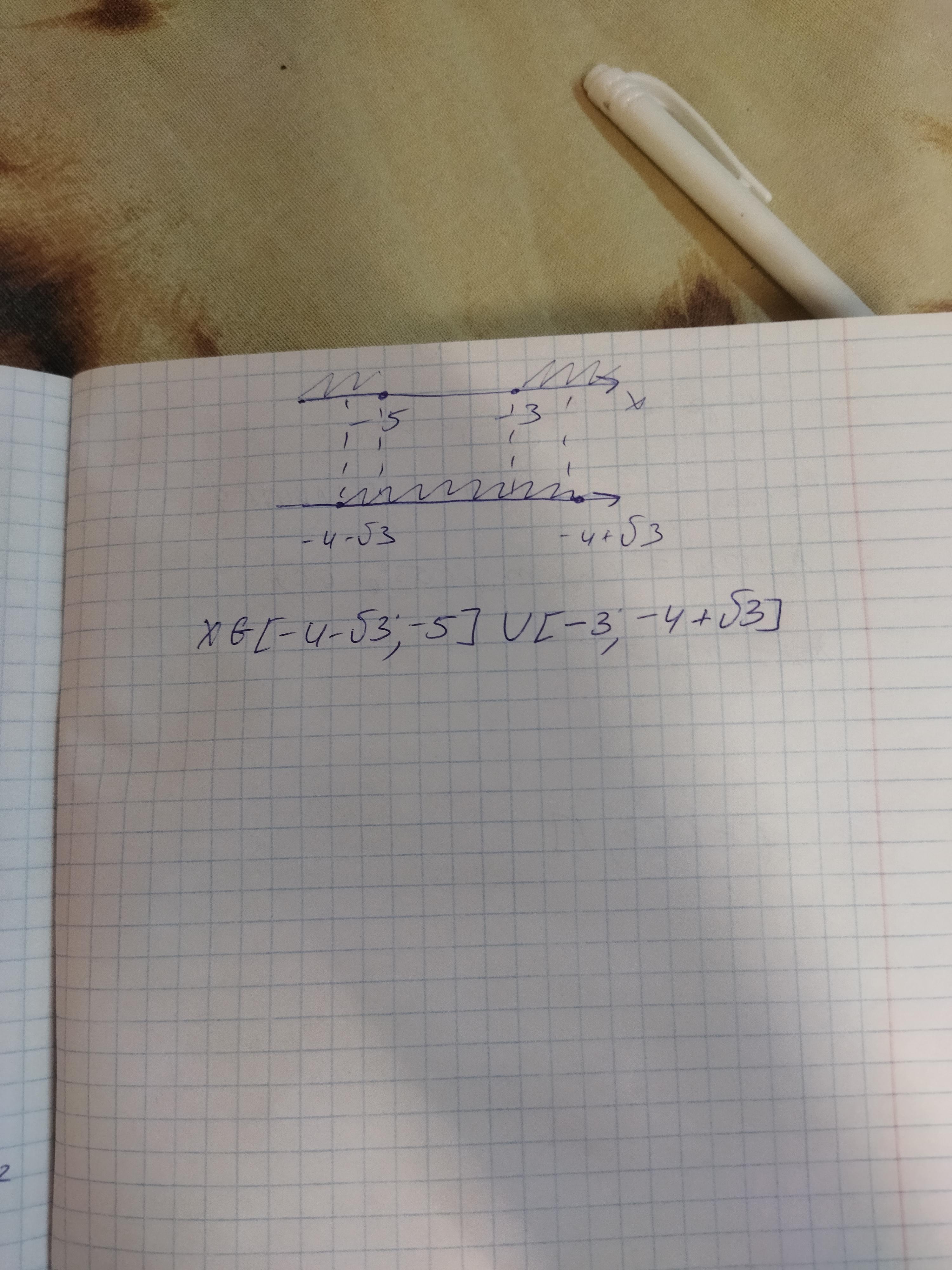x ∈ [-4-Корень из трёх; -5] ∪ [-3;-4 + Корень из трёх]