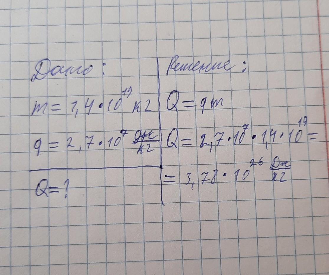 Q=2,7*10^7 (Дж/кг)*1, 4*10^19 (кг) = 3,78*10^26 Дж
