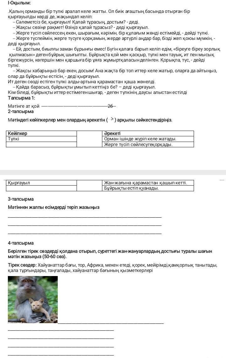 ПОМОГИТЕ БЫСТРЕЙ С СОРОМ ПОЖАЛУЙСТА ПОЖАЛУЙСТА (((((((((((((((УМОЛЯЮ!!!!!Юкылым: Калын орманды бiр тулкi аралап келе жатты. Ол биiк агаштың басында отырған бір қырғауылды кердi де, жақындап келіп -Сәлеметсіз бе, қырғауыл! Қалай тұрасыӊ, достым? - деді. -Жаксы сезiне рақмет! Өзiңiз қалай турасыз? - деді қырғауыл. Жерге түсiп сөйлессен екен, шырағым, кәрiмiн, бiр кулагым женді естімейді, - дейдi тулкі. -Жерге түспеймiн, жерге тусуге қорқамын, жерде әртүрлi андар бар, бiздi жеп қоюы мумкiн дедi кыргауыл. -Ей, достым, биылғы заман бурынгы емес! Бүгiн қалаға барып келiп едiм, бiреуге кылмасын» деген бұйрық шығыпты. Бұйрықта қой мен қасқыр, түлкi мен тауық, ит пен мысык бiргежурсiн, көгершін мен қаршыға бiр уяга жумыртқаласын делiнген. Қорықпа, түс,-дейдi тулкi. бiреу зорлық -Жақсы хабарыныз бар екен, досым! Ана жақта бір топ иттер келе жатыр, оларга да айтыныз. олар да бұйрықты естiсiн, - деді қырғауыл. Ит деген сөзді естіген тулкi алды-артына қарамастан каша женелді. -Кайда барасыз, бұйрықты ұмытып кеттiнз бе? - дедi кыргауыл. Кiм бiледi, буйрыкты иттер естімеген шығар,-деген тулкiнiң даусы алыстан естiлдi Тапсырма 1: Мәтінге ат қой