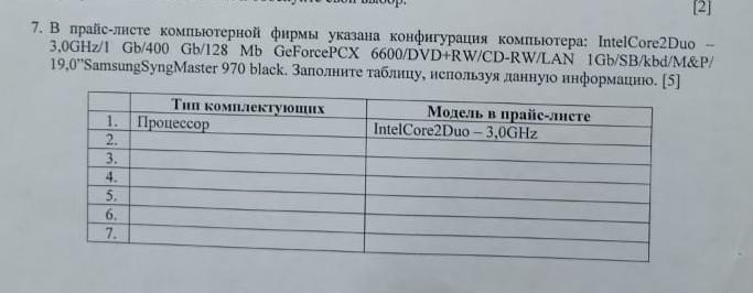 В прайс-листе фирмы указана конфигурация компьютера: IntelCore2Duo- 2,8GHZ/1 Gb/800 Gb/256 Mb GeForcePСХ 7200/DVD+RW/CD-R/LAN 2Gb/SB/kbd/M&P/ 21,0'SamsungSуngMaster 1200 black. Заполните таблицу, используя данную информацию.