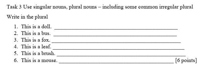 Task 3 Use singular nouns, plural nouns – including some common irregular plural Write in the plural 1. This is a doll. ____________________________________________ 2. This is a bus. ____________________________________________ 3. This is a fox. ______________________________________________ 4. This is a leaf. _______________________________________________ 5. This is a brush. ______________________________________________ 6. This is a mouse. _________________________________________
