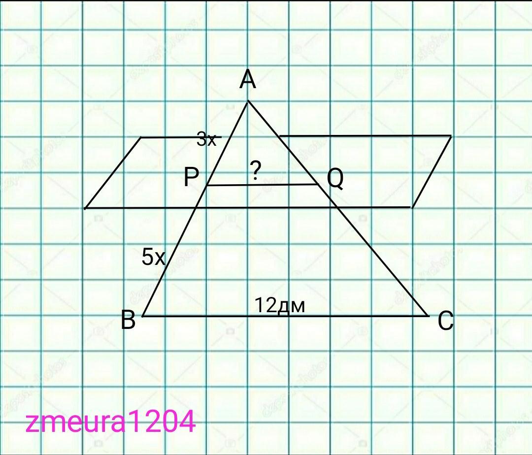 Дано трикутник АВС площина паралельна прямій ВС перетинає сторону АВ в точці Р а сторону АС в точці Q. Точка Р ділить відрізок АВ у відношенні 3:5 рахуючи від точки А. Знайдіть довжину відрізка РQ якщо ВС=12дм