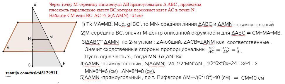 Через точку М-середину гипотенузы АВ прямоугольного Δ АВС , проведена плоскость параллельно катету ВС,которая пересекает катет АС в точке N. Найдите СМ если ВС: АС=6: S(Δ АМN) =24см²