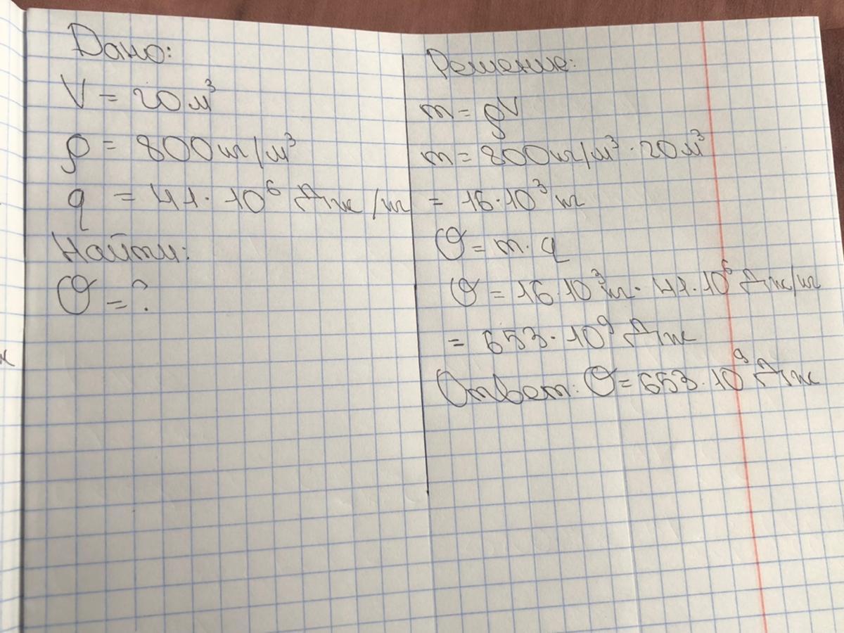 Сколько теплоты выделится при полном сгорании нефти объемом 20 м3? (плотность нефти найти в интернете) (массу найти через плотность и объём)