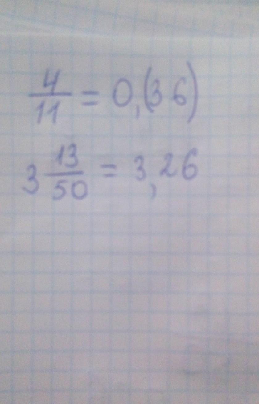 перетвори десятковий дріб у разі одержання нескінченного дробу ділення припинити після визначення періоду 4/11 ; 3 13/50!! 15 баллов срочно пожалуйста!! могу и двадцать !