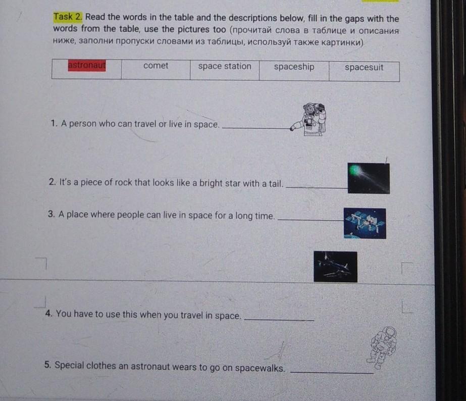 Task 2. Read the words in the table and the descriptions below, fill in the gaps with the words from the table, use the pictures too (прочитай слова в таблице и описания ниже, заполни пропуски словами из таблицы, используй также картинки) astronaut comet space station spaceship spacesuit 1 1. A person who can travel or live in space. 2. It's a piece of rock that looks like a bright star with a tail. 3. A place where people can live in space for a long time. 4. You have to use this when you travel in space. 5. Special clothes an astronaut wears to go on spacewalks.
