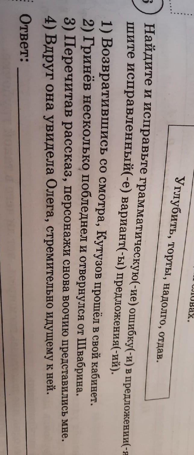 1. Возвратившись со смотра, Кутузов прошёл в свой кабинет 2. Гринёв несколько побледнел и отвернулся от Швабрина.3. Перечитав рассказ, персонажи снова воочию представились мне. 4. Вдруг она увидела Олега, стремительно идущему к ней.