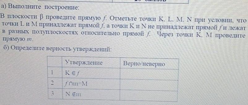 1. а) Выполните построение В плоскости в проведе прямую f. Отметьте точки K, L. N. N при условии, что точки L и VI принадлежат прямой f, а точки и не принадлежат прямой и лежат в разных потутилоскостях относительно прямой f. Через точкі К. І проведите прямую т. б) Отпредете верность утверждений: Утверждение Верно неверно
