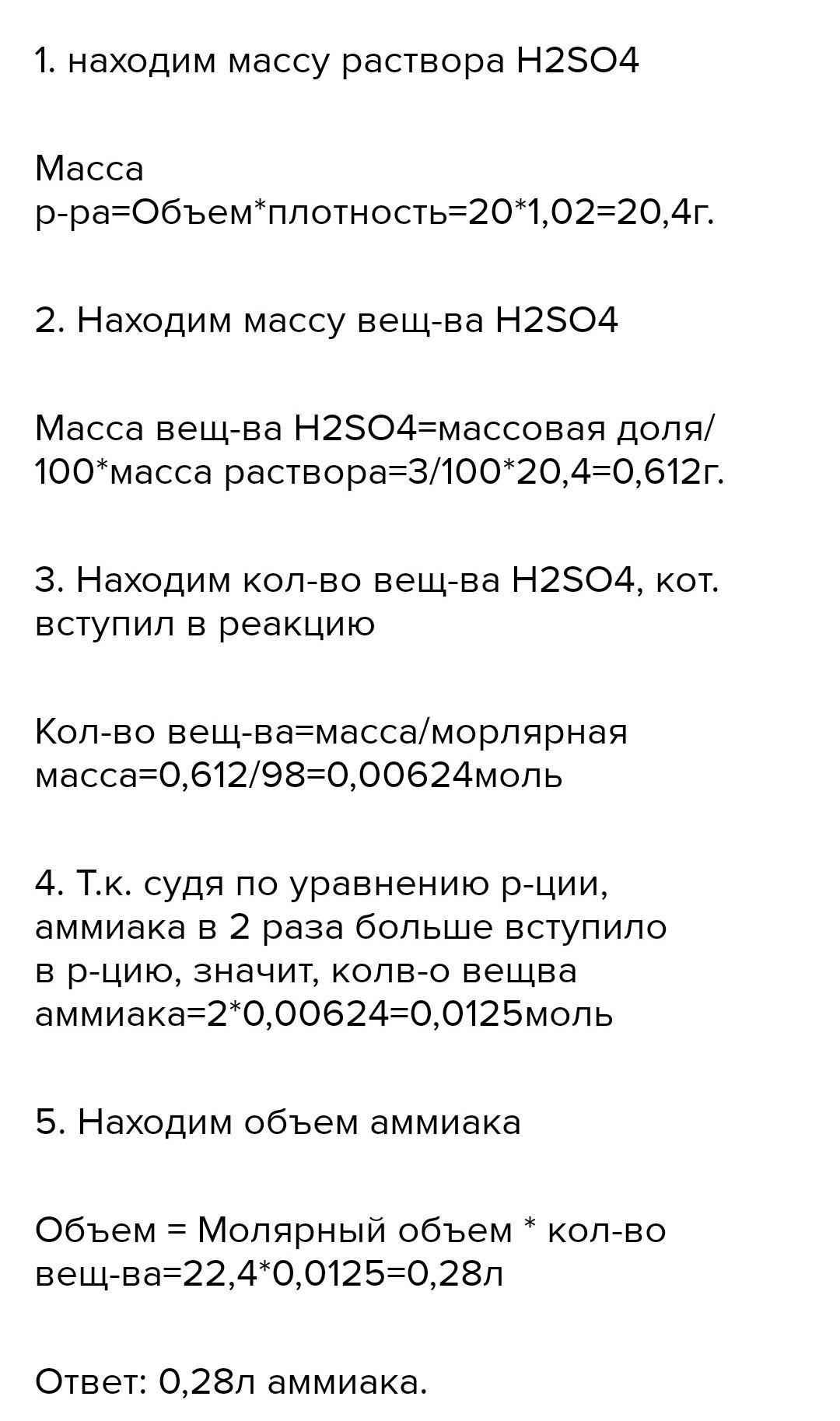 Вычислите объем аммиака н. у. который потребуется для полной нейтрализации раствора серной кислоты объемом 20 см³ массовой долей кислоты 3% и плотностью раствора 1,2 г/см³ Рассчитайте массовую долю ионов аммония в полученном растворе