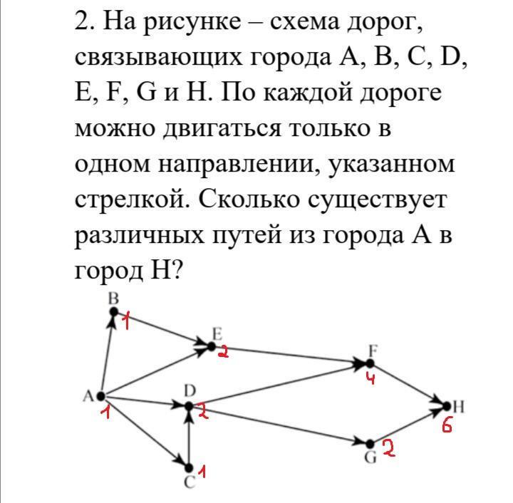 2. На рисунке - схема дорог, связывающих города A, B, C, D, E, F, G и H. По каждой дороге можно двигаться только в одном направлении, указанном стрелкой. Сколько существует различных путей из города A в город H?
