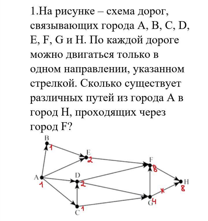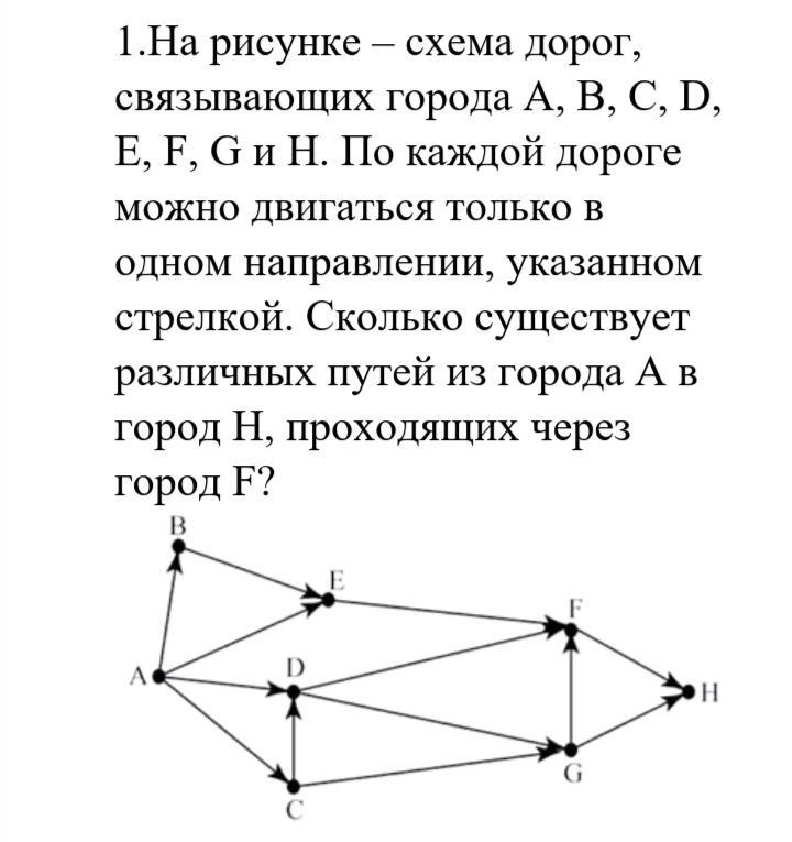1. На рисунке - схема дорог, связывающих города A, B, C, D, E, F, G и H. По каждой дороге можно двигаться только в одном направлении, указанном стрелкой. Сколько существует различных путей из города A в город H, проходящих через город F?