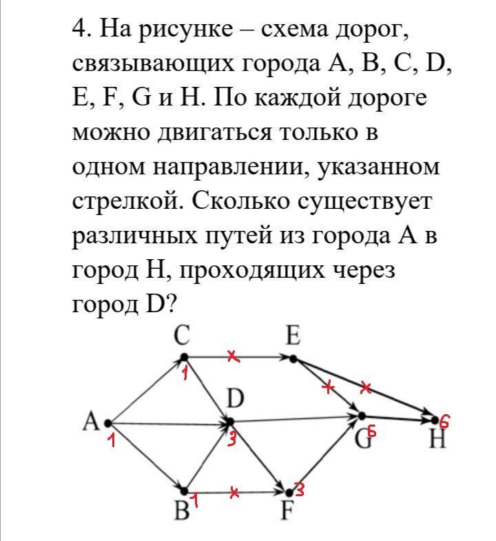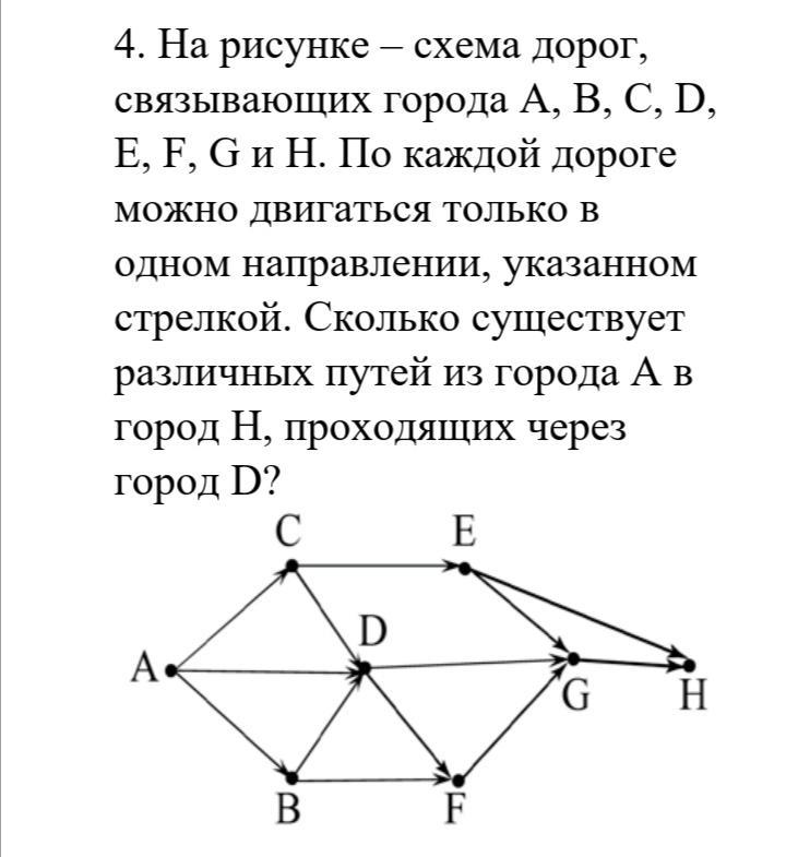 4. На рисунке - схема дорог, связывающих города A, B, C, D, E, F, G и H. По каждой дороге можно двигаться только в одном направлении, указанном стрелкой. Сколько существует различных путей из города A в город H, проходящих через город D?