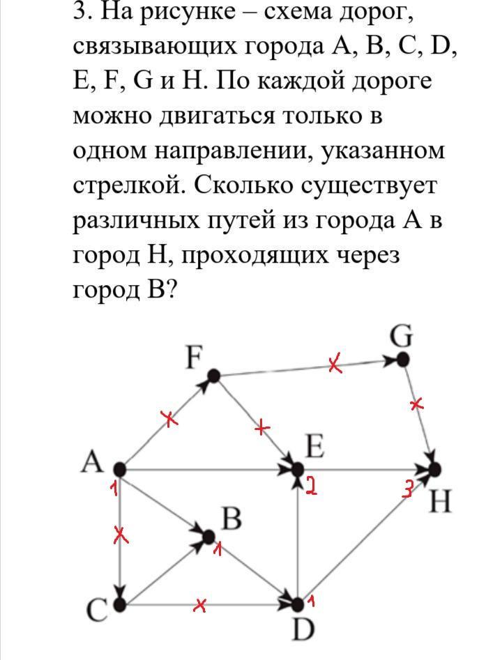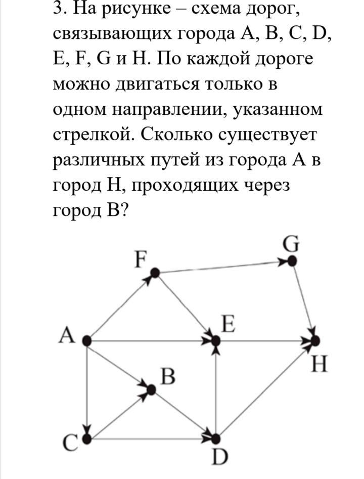 5. На рисунке - схема дорог, связывающих города A, B, C, D, E, F, G и H. По каждой дороге можно двигаться только в одном направлении, указанном стрелкой. Сколько существует различных путей из города A в город H, проходящих через город B?