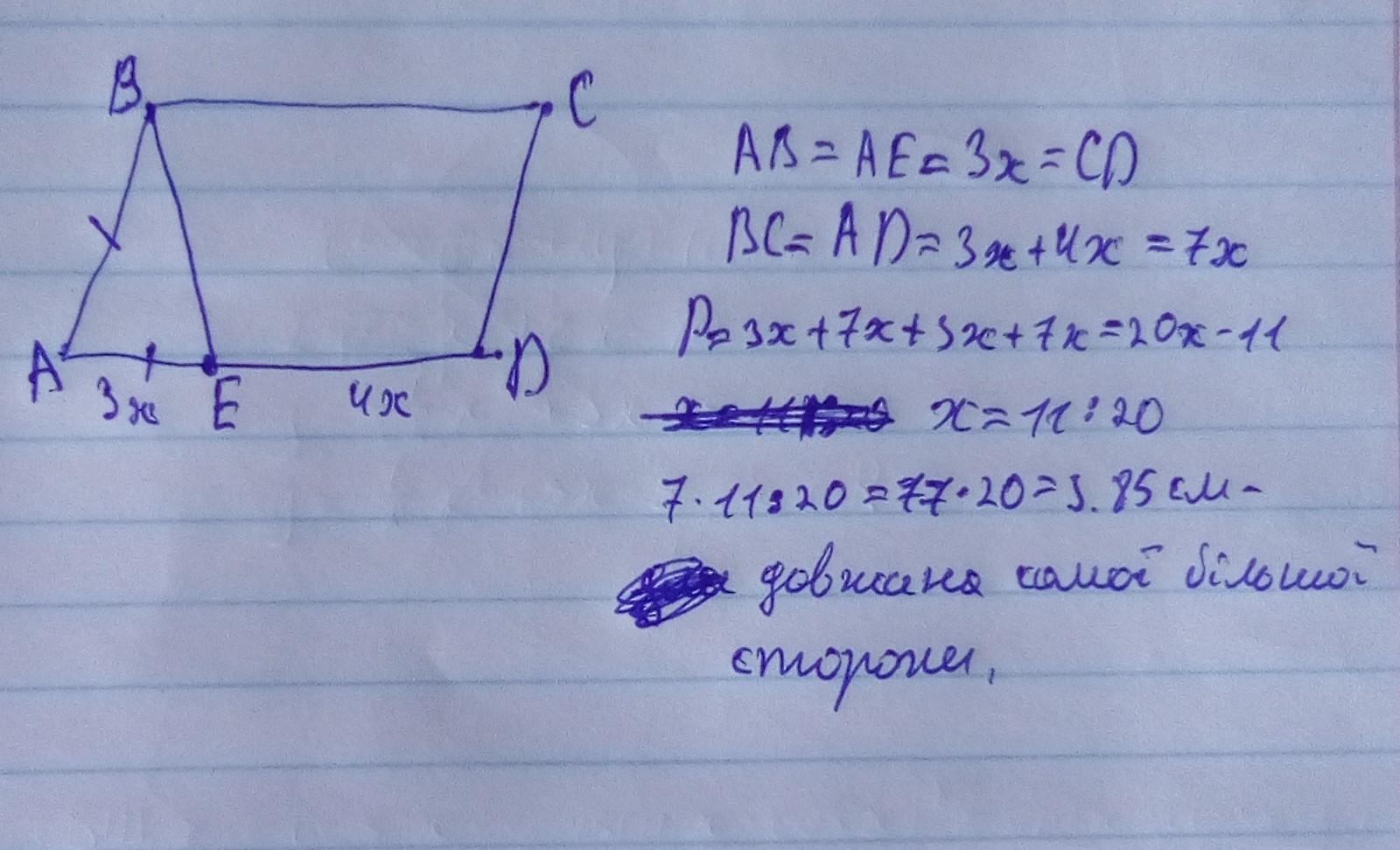 биссектриса тупого угла параллелограмма делит противоположную сторону в отношении 3 к четырём считая от вершины острого угла Найдите большую сторону параллелограмма если его периметр равен 11