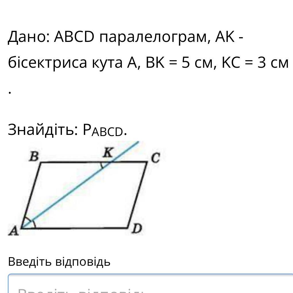 BC= BK+KC= 8см => BC=AD (по свойству параллелограмма)