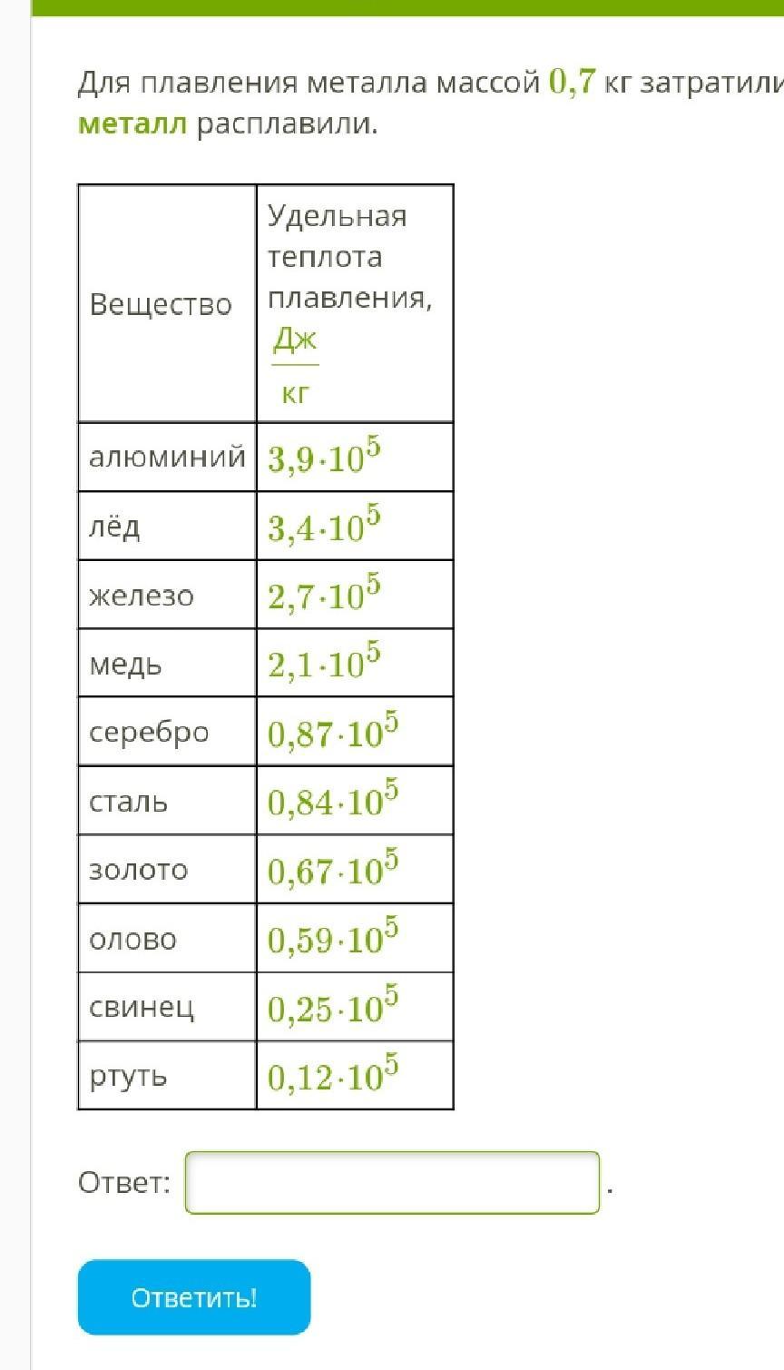 Для плавления металла массой 0,7 кг затратили 61 кДж тепла. Используя данные таблицы, определи, какой металл расплавили.