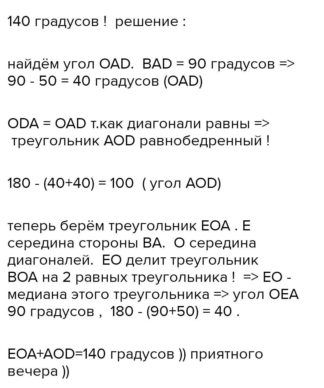 Объяснение:ЕАО - прямоугольный треугольник. Следовательно, уголЕОА = 180 - 90 - 35=55. АВО - равнобедренный, следовательно, угол ВАО = АВО = 35. Следовательно, угол ВОА = 180-2*35=110. Найдем АОС. Т.к ВОД - развернутый угол (т.е. равный 180) то можно найти АОД. 180 - 110 =70. Найдем угол ЕОД. Он равен 55+70=125.