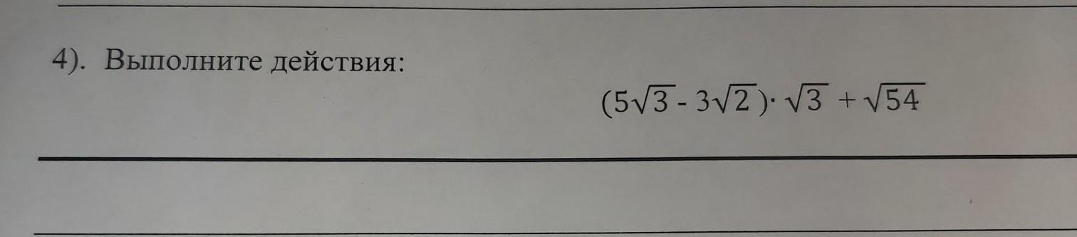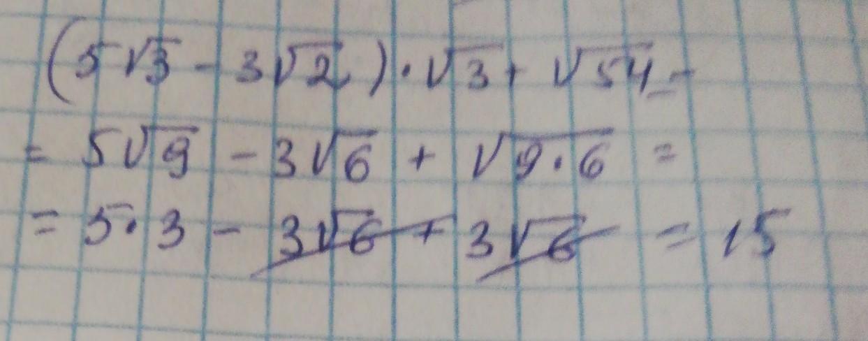 (5√3-3√2)*√3+√(54)54=5√3√3-3√2*√3+√(54)=5*3-3√6+√(9*6)= =15-3√6+3√6=15