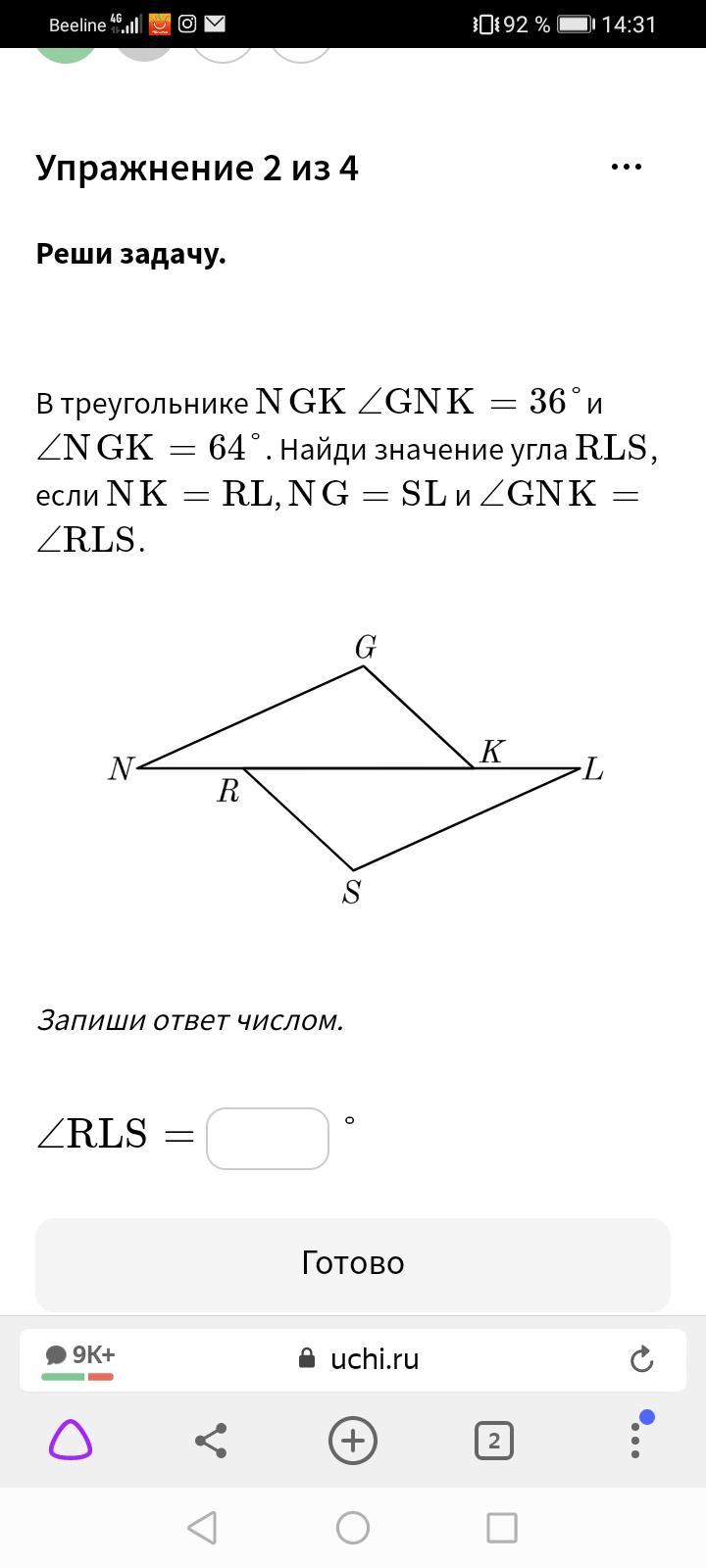 угол RLS= 36градусов, т к треугольники равны по 2 сторонам и углу между ними ( 1 признак)