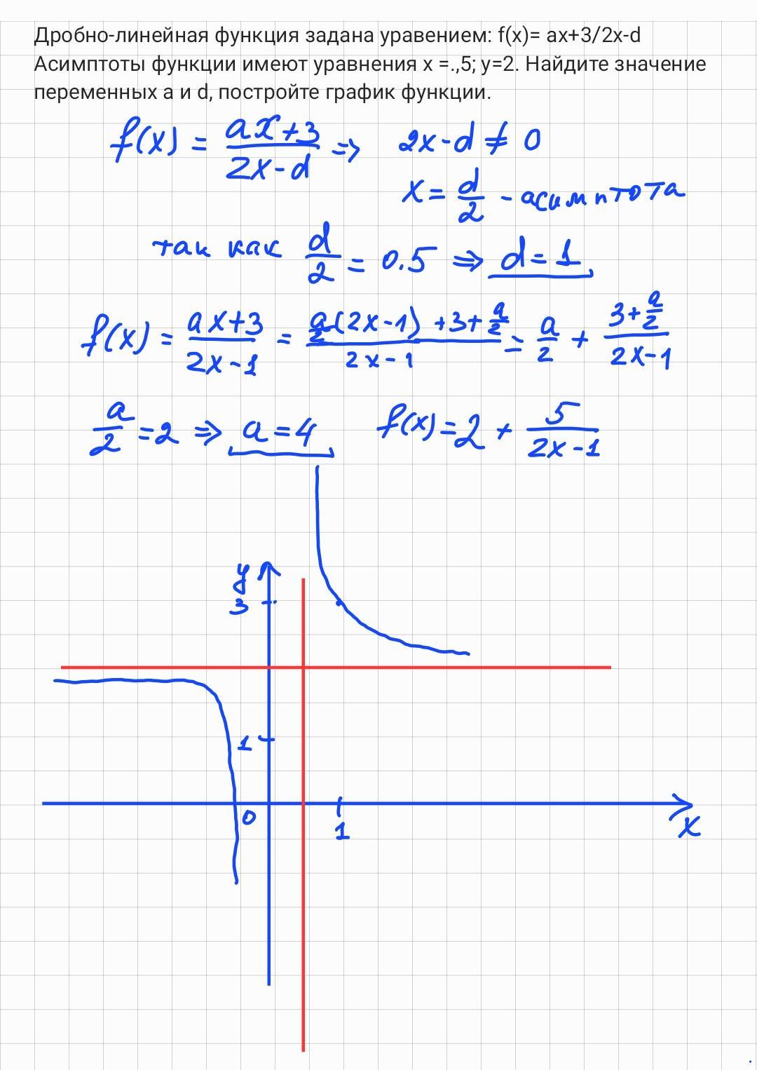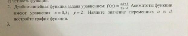 Дробно-линейная функция задана уравением: f(x)= ax+3/2x-d Асимптоты функции имеют уравнения x =.,5; y=2. Найдите значение переменных a и d, постройте график функции.