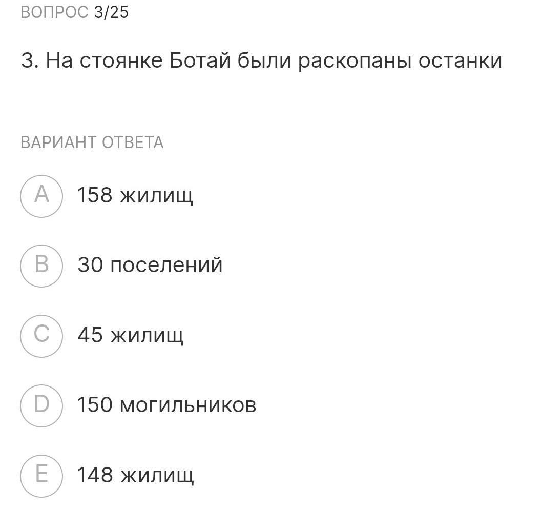 Ответ А (158 жилищ было раскопано на стоянке Ботай)