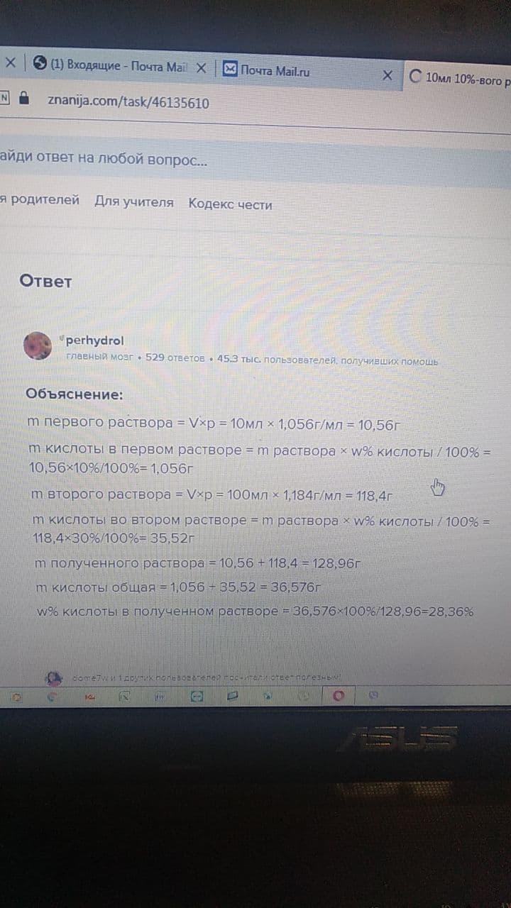m кислоты в первом растворе = m раствора × w% кислоты / 100% = 10,56×10%/100%= 1,056г