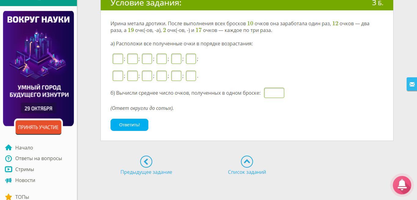 б) среднее число очков — среднее арифметическое — сложить все числа и разделить на количество чисел:
