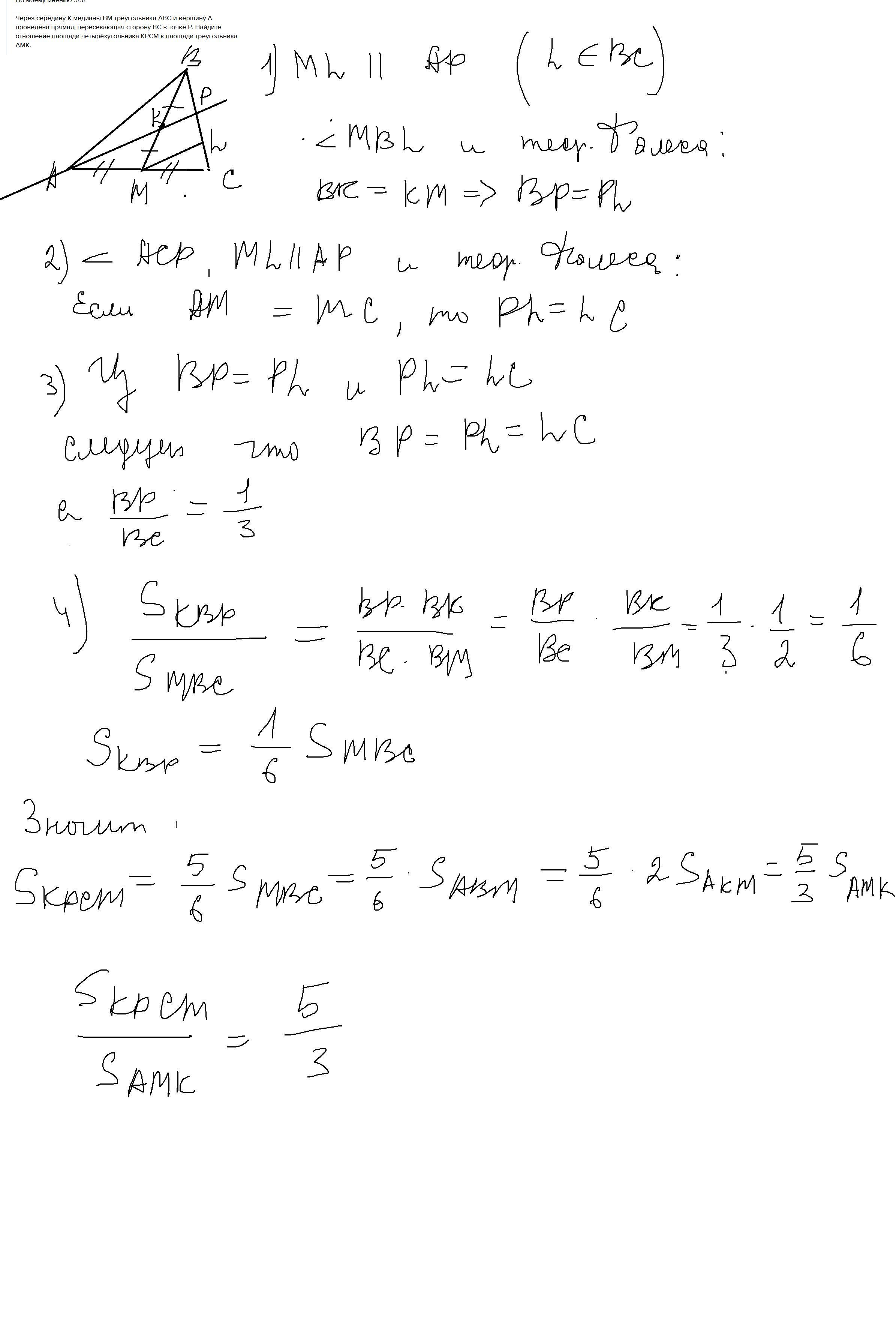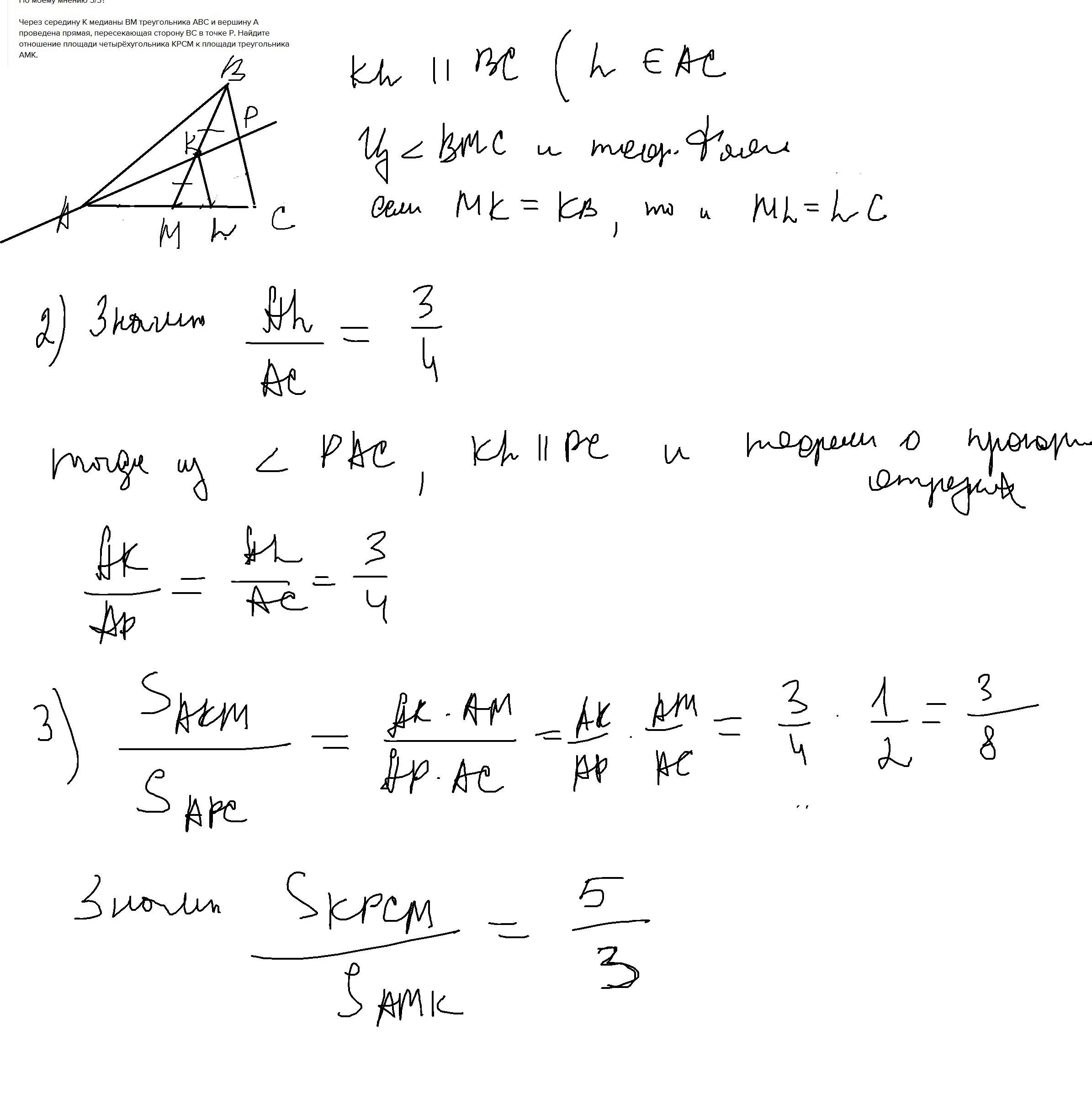 Через середину K медианы BM треугольника ABC и вершину A проведена прямая, пересекающая сторону BC в точке P. Найдите отношение площади четырёхугольника KPCM к площади треугольника AMK.