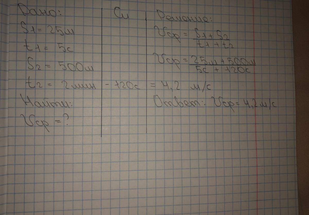 Велосипедист скатился с горы, длина которой 25 м за 5 с, продолжив движение, доехал до остановки на расстоянии 500 м за 2 мин. Определите среднюю скорость велосипедиста.