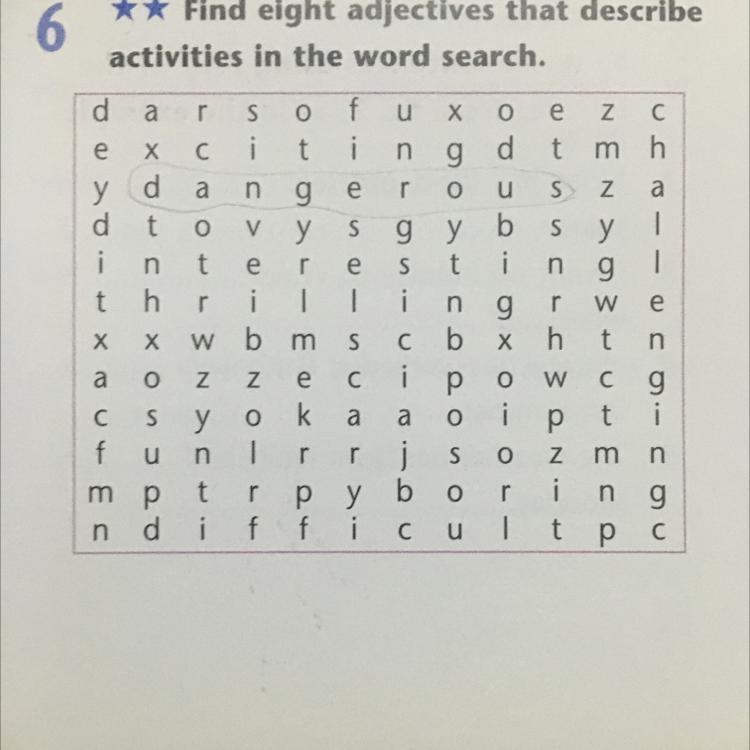 exciting ,interesting,thrilling,boring,difficult,scary,challenging