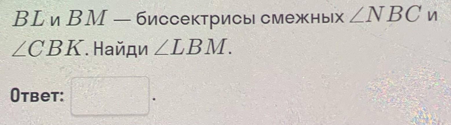 сумма двух смежных углов - 180°. Биссектрисы делят оба угла пополам. значит угол LBM =90°