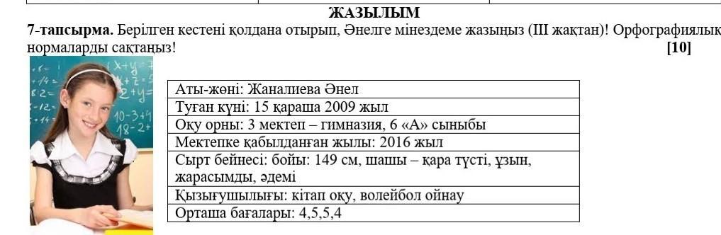 7-тапсырма. Берілген кестені қолдана отырып, Әнелге мінездеме жазыңыз (ІІІ жақтан)! Орфографиялық нормаларды сақтаңыз!