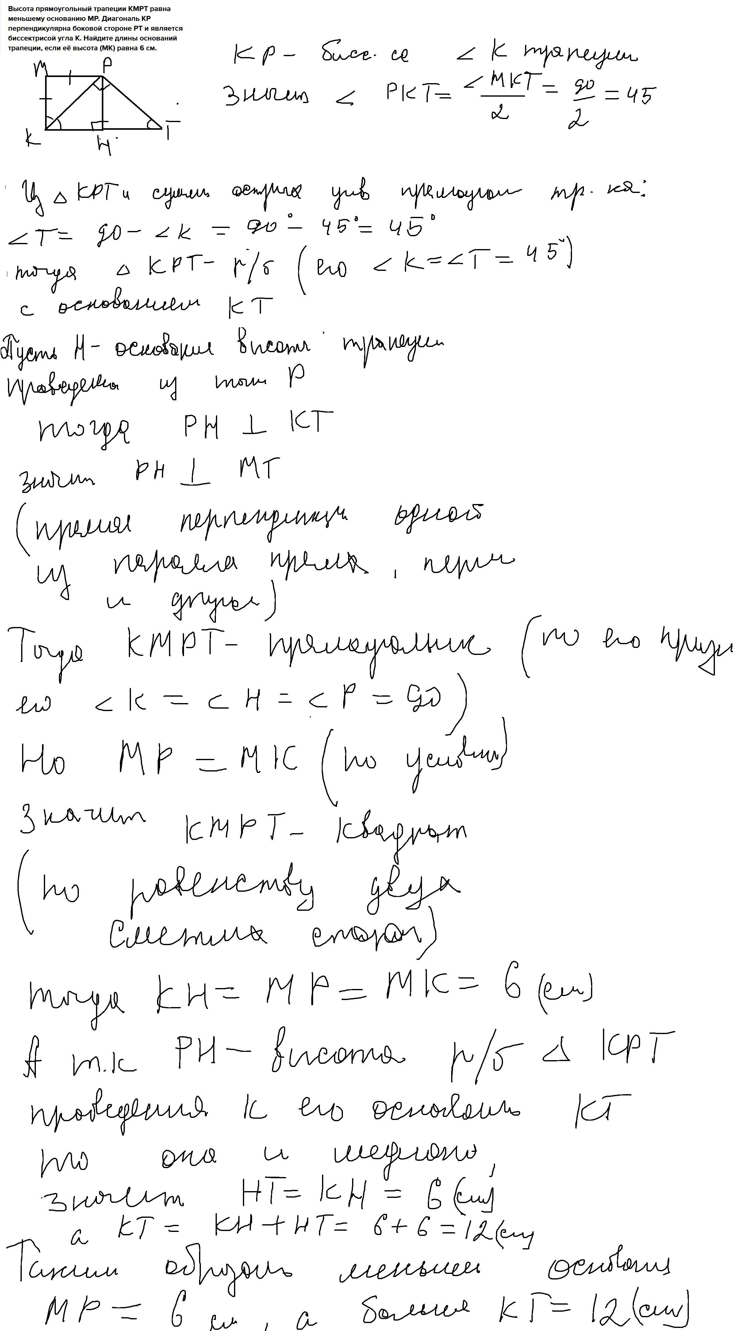 Высота прямоугольный трапеции KMPT равна меньшему основанию MP. Диагональ KP перпендикулярна боковой стороне PT и является биссектрисой угла K. Найдите длины оснований трапеции, если её высота (MK) равна 6 см.