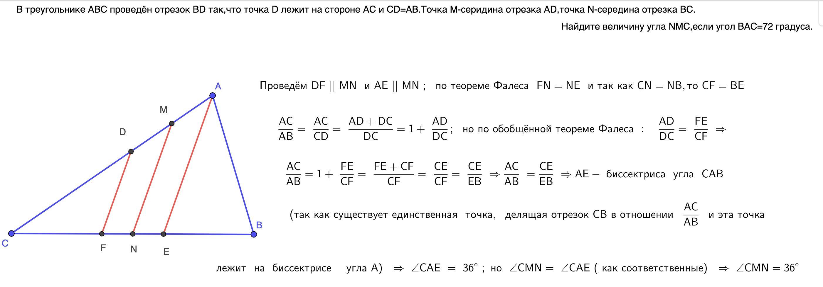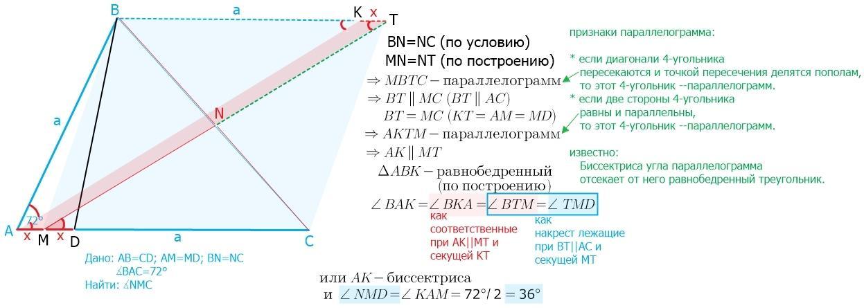 (100 баллов). В треугольнике ABC проведён отрезок BD так,что точка D лежит на стороне AC и CD=AB.Точка M-серидина отрезка AD,точка N-середина отрезка BC.Найдите величину угла NMC,если угол BAC=72 градуса.С решением