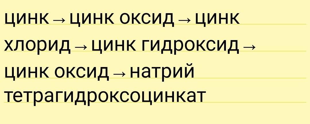 Zn ⟶ ZnO ⟶ ZnCl₂ ⟶ Zn(OH)₂ ⟶ ZnO ⟶ Na₂[Zn(OH)₄]