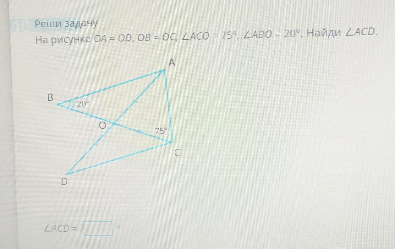 Сравним треугольники ABO и ODC, они будут равны по 2 признаку, следовательно угол ABO = углу OCD = 20°