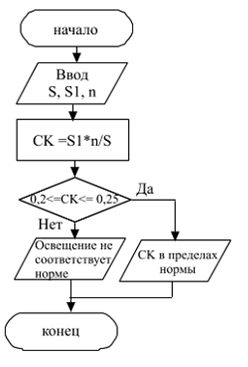 При планировании образовательных помещений одним из условий является достаточность естественной освещенности классов. Световой коэффициент СК рассчитывается по формуле СК=S1*n/S, где S – площадь помещения; S1 – площадь одного застекленного окна в помещении; n- количество окон в помещении. Нормальным считается значение CK= 0,2..0,25.