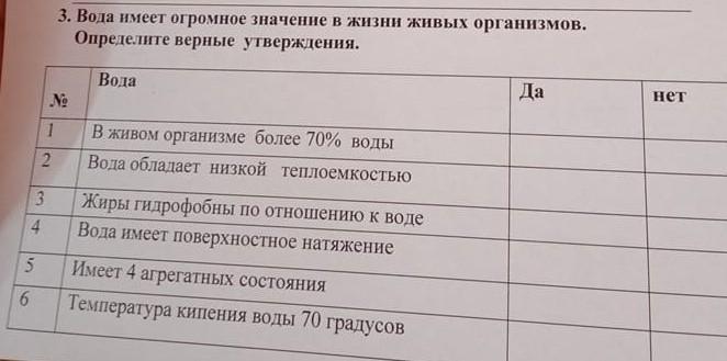 да имеет огромное значение в жизни живых организмов Определите верное утверждение вода в живом организме более 70% воды вода обладает низкой теплоёмкостью жиры гидрофобные по отношению к воде вода имеют поверхностное натяжение имеют 4 главных состоянии температура кипения воды 70 градусов да и нет
