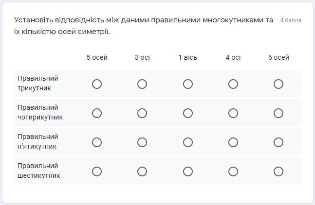 Установите соответствие между данными правильными многоугольниками и их количеством осей симметрии