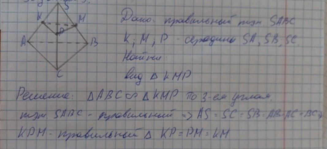 Постройте правильный тетраэдр sabc точки K, M и P середины ребер sa sb и sc. Определите вид треугольника KMP