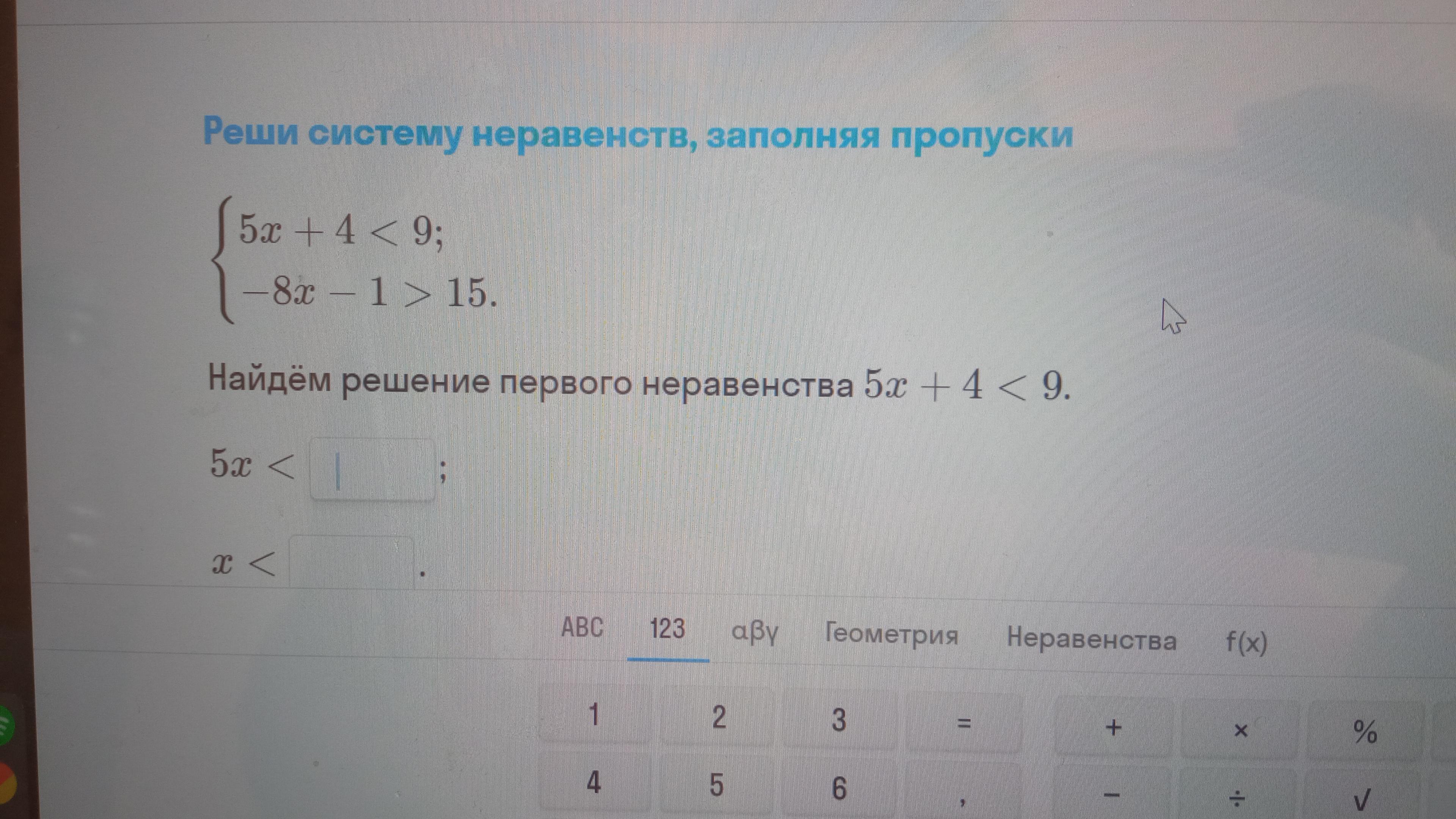 Реши систему не вспомним попуски. Найди решение 1 неравенство. 5 икс + 4 4 меньше 9.