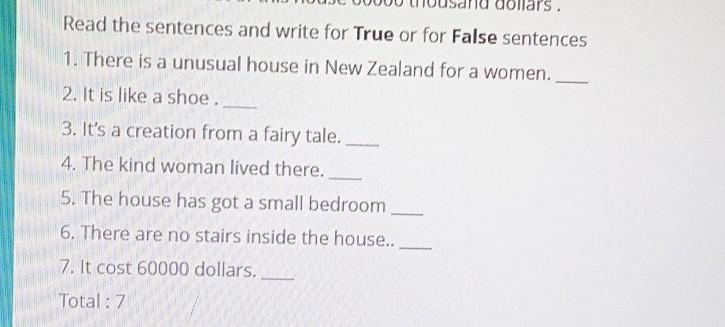Read the sentences and write for True or for False sentences 1. There is a unusual house in New Zealand for a women. 2. It is like a shoe. 3. It's a creation from a fairy tale. 4. The kind woman lived there. 5. The house has got a small bedroom 6. There are no stairs inside the house.. 7. It cost 60000 dollars. Total: 7 помоготе пожалуйста это сор по английскому