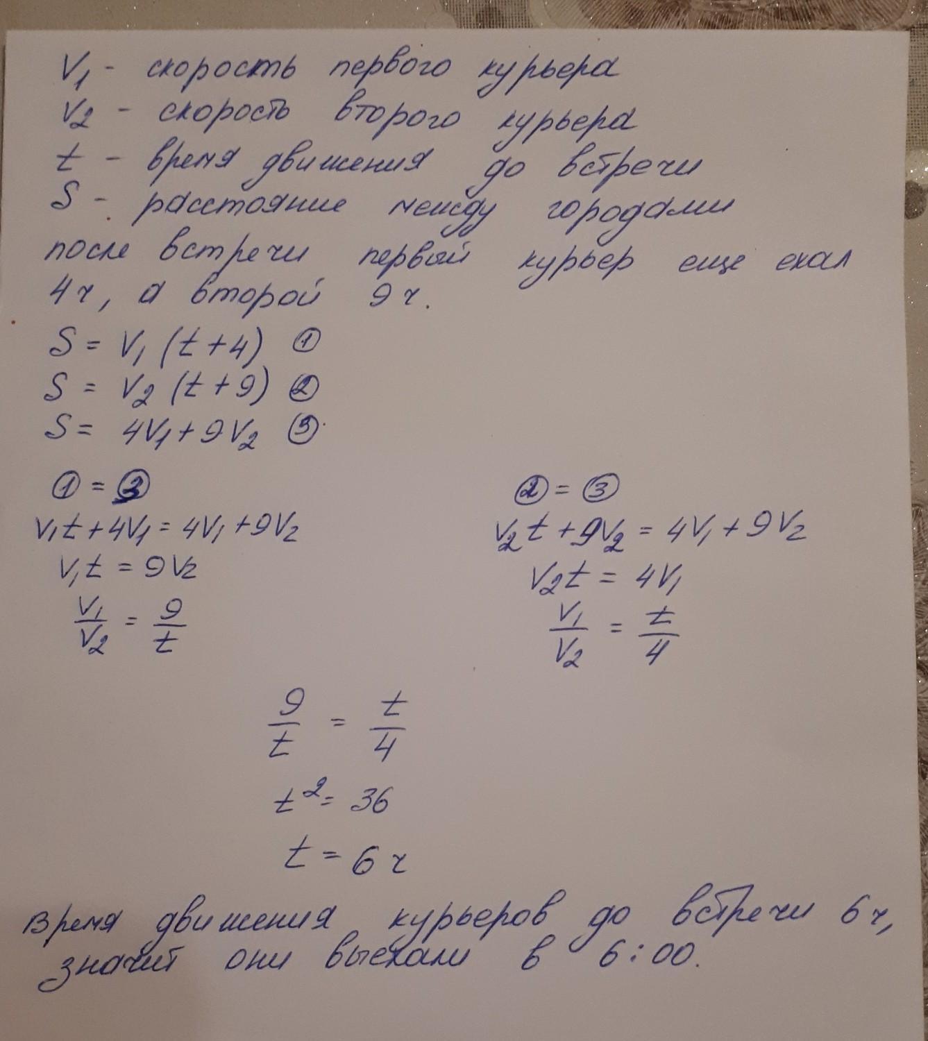 Из Челябинска в магнитогорске из Магнитогорска в Челябинск выехали одновременно два курьера. в 12 часов дня они проехали мимо друг друга продолжая движения курьер прибыли в свои пункты назначение соответственно 16:00 и в 21:00. определите время выезда курьеров.