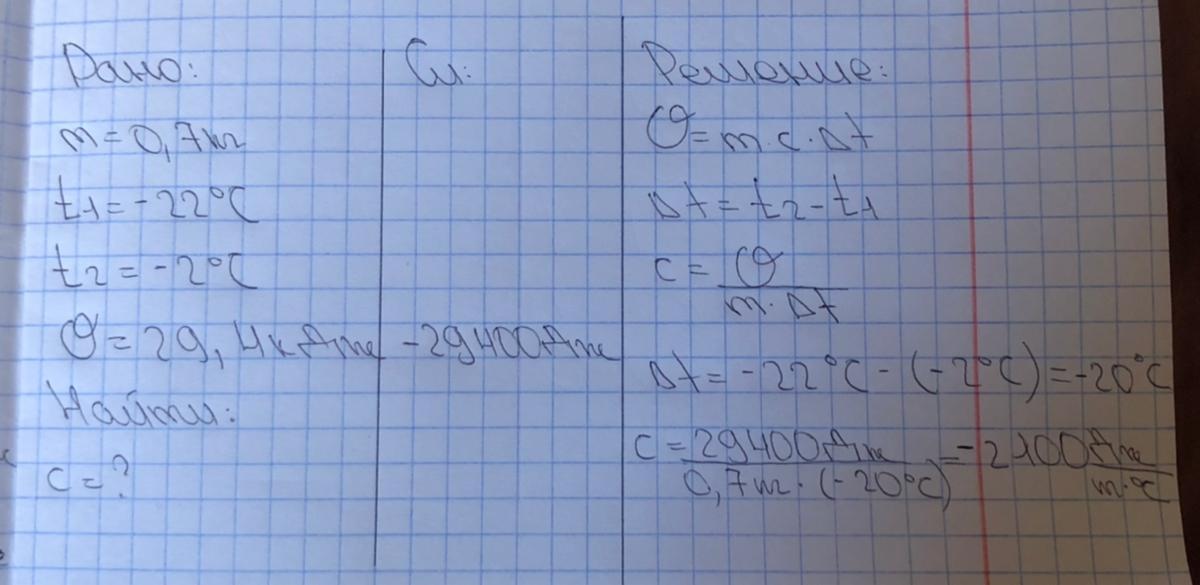 Кусок льда массой 0,7 кг нагревают от −22°C до −2°C, затрачивая при этом количество теплоты 29,4 кДж. Определи удельную теплоёмкость льда. Ответ (округли до сотых): Дж/(кг·°C).