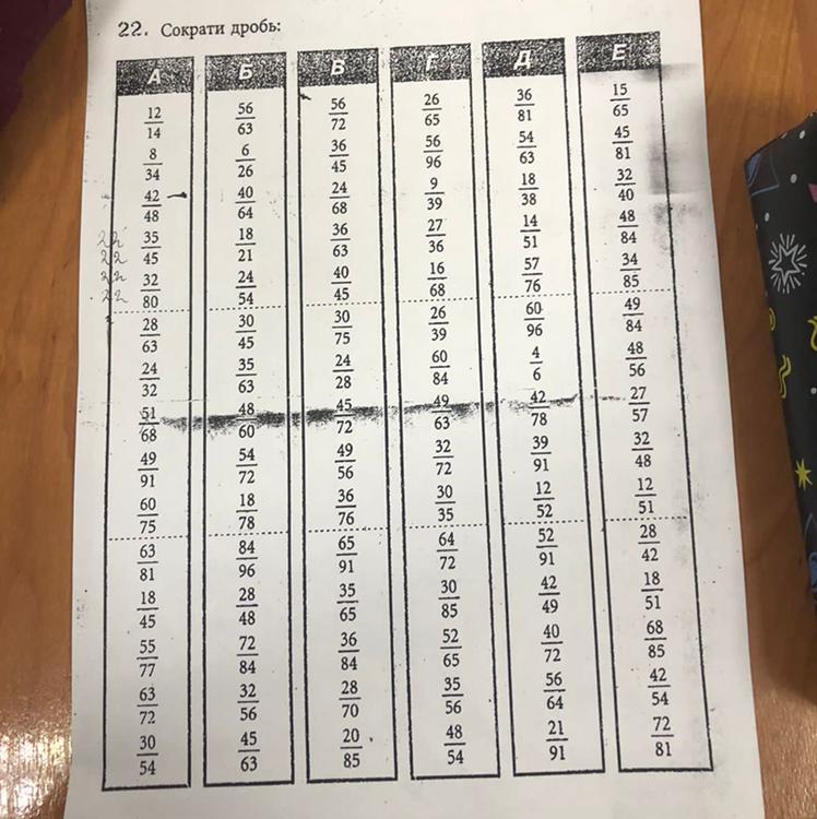 Г) 26/65=2/5,56/96=7/12,9/39=3/13,27/36=3/4,16/68=4/17,26/39=2/3,60/84=5/7,49/63=7/9,32/72=4/9,30/35=6/7,64/72=8/9,30/85=6/17,52/65=4/5,35/56=5/8,48/54=8/9.