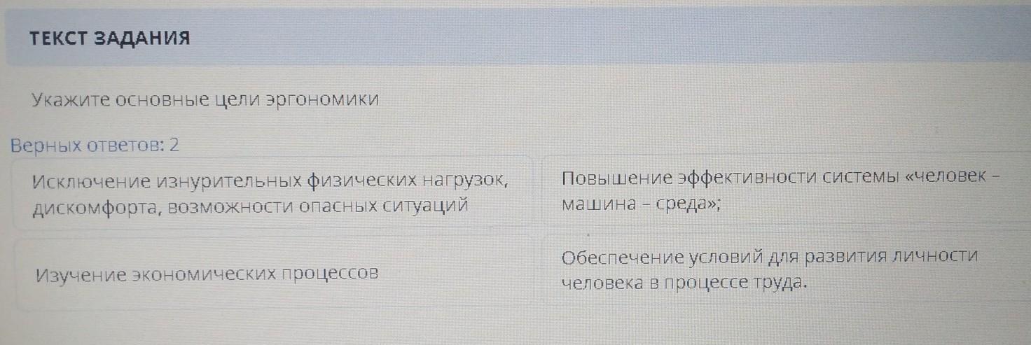 ТЕКСТ ЗАДАНИЯ Укажите основные цели эргономики 2 урока Берных ответов: 2 Исключение изнурительных физических нагрузок. Аскомфорта, возможности опасных ситуаций Повышение эффективности системы «человек – машина - среда», Изучение закономических процессов обеспечение условий для развития личности человека в процессе труда.