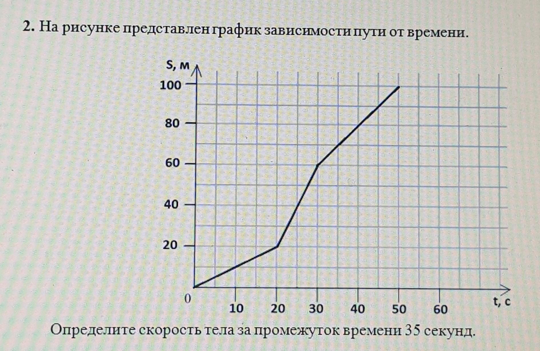 на рисунке представлен график зависимости пути от времени. определите скорость тела за промежуток времени 35 секунд.