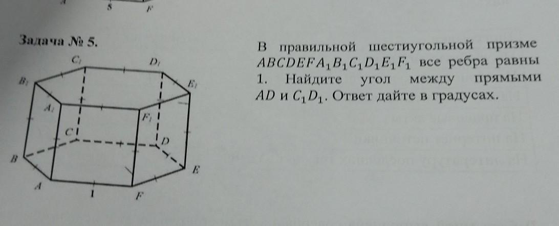 AD параллельно A1D1 ведь это призма а за свойством угла между прямыми угол между AD и C1D1 = A1D1 and C1D1 В верхнем шестиугольнике каждый угол равен 120. Треугольник C1D1E1 - равнобедренный и прямая A1D1 будет и высотой и биссектрисой ведь это шестиугольник. Тогда этот угол равен половине от угла C1D1E1 то есть 60 градусов