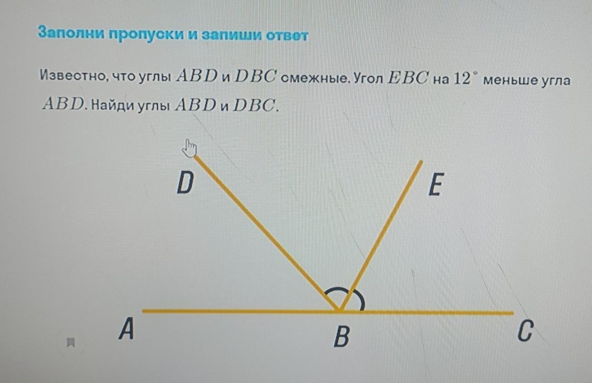 Известно, что углы ABD и DBC смежные. Угол ЕВС на 12° меньше угла ABD. Найди углы ABD и DBC. Пж с решением
